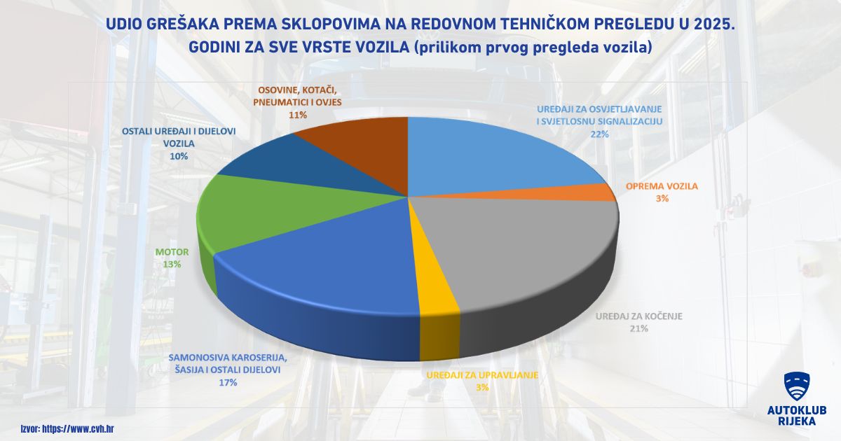 Tijekom 2025. godine redovnom tehničkom pregledu pristupilo je 2.559.154, a neispravno ih je bilo 425.498 odnosno 17 % posto vozila nije prošlo tehnički pregled prilikom prvoga pregleda. Neispravna vozila imala su u prosjeku šest grešaka. Od uočenih nedostataka najveći broj se odnosi na uređaje za osvjetljavanje i svjetlosnu signalizaciju, 22,56% te na uređaje za kočenje, 20,99 %.